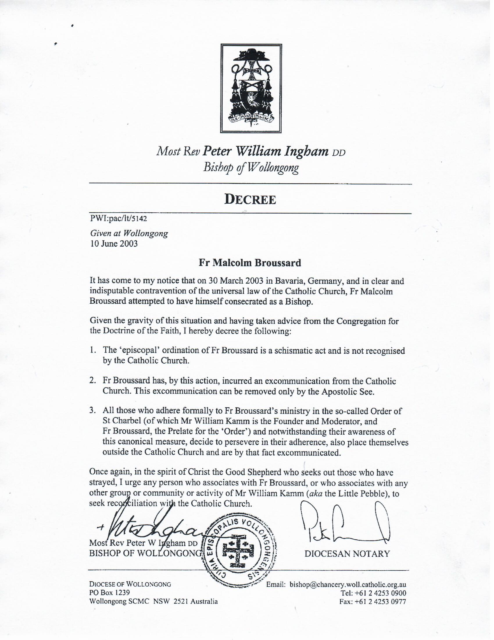 Be aware that all followers of William Kamm (Costellia), also known as the Little Pebble, are excommunicated by the Catholic Church as of 10 June 2003 (under the pontificate of Pope John Paul II and in accordance with the Congregation of the Doctrine of Faith under Cardinal Joseph Ratzinger (Pope Emeritus Benedict XVI).